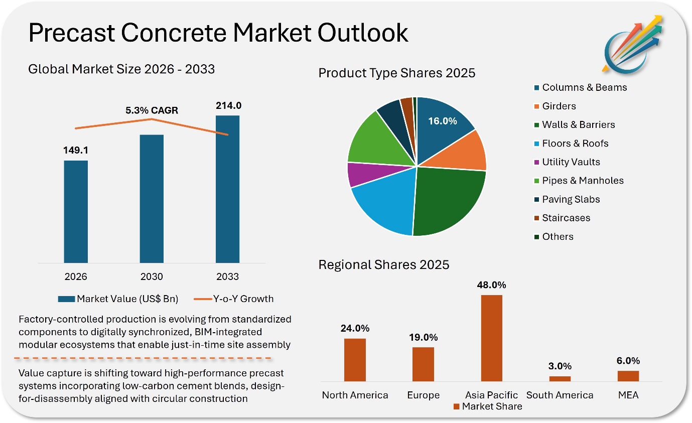 New York, NY, March 03, 2026 (GLOBE NEWSWIRE) -- The global precast concrete market is estimated to be valued at USD 149.1 billion in 2026 and is forecast to reach USD 214.0 billion by 2033, witnessing an annualised growth rate of 5.3% over the same period. The precast concrete market is in the intersection of infrastructure modernization, housing shortages and industrial construction expansion. Pre-engineered structural components ranging from beams and columns to wall panels and pipes are enabling faster, cost-efficient as well as quality-controlled construction. Digitization of manufacturing, automation in batching and curing and growing integration with building information modelling are reshaping operational efficiency.
